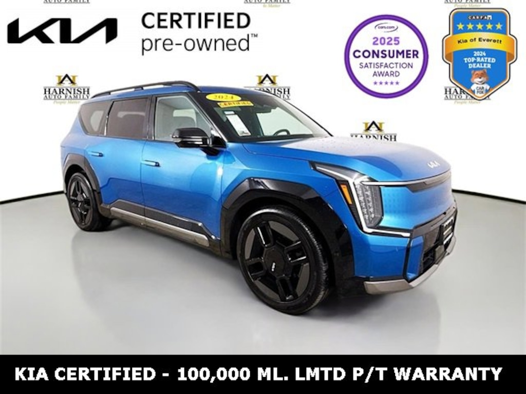 *AMERICAS BEST WARRANTY, *KIA FACTORY CERTIFIED*, *REMAINDER OF FACTORY WARRANTY, *NEW MARKDOWN, *ONE-OWNER, *ALL WHEEL DRIVE, *PANORAMIC ROOF, *QUAD CAPTAIN SEATS, *3RD ROW SEATING, *LUXURY OPTIONS, *TECH PKG., *COLLISION AVAOIDANCE SYSTEM, *CONCERT-LIKE SOUND SYSTEM, *SYNTECH SEATS, *POWER LIFTGATE, *HEATED AND COOLED SEATS, *HEATED STEERING WHEEL, *PRIVACY GLASS / TINT, *APPLE CARPLAY, *NAVIGATION, VIP RELAXATION PKG, EV9 GT-Line, Electric Motor, 1-Speed Automatic, AWD, Ocean Blue, Brown/Black Leather, 2nd Row 8-Way Power Seats, 3rd row seats: split-bench, Apple CarPlay & Android Auto, Auto High-beam Headlights, Auto-dimming Rear-View mirror, Automatic temperature control, Brake assist, Delay-off headlights, Electronic Stability Control, Emergency communication system: 911 Connect, Exterior Parking Camera Rear, Front dual zone A/C, Front Passenger Premium Relaxation Comfort Tilt Seat, Fully automatic headlights, Garage door transmitter: HomeLink, GTL 2nd Row VIP Relaxation Package, Heads-Up Display, Heated & Ventilated Front Bucket Seats, Heated door mirrors, Heated rear seats, Memory seat, Navigation System, Panic alarm, Power driver seat, Power Liftgate, Power moonroof, Radio: AM/FM/MP3/HD Radio/SiriusXM Meridian Audio, Rain sensing wipers, Remote keyless entry, Security system, Smart Key w/ Push Button and Remote Start, Steering wheel memory, Steering wheel mounted audio controls, SynTex Leather Seats, Telescoping steering wheel, Turn signal indicator mirrors, Ventilated rear seats.