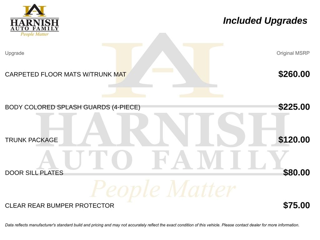 While every reasonable effort is made to ensure the accuracy of this data, we are not responsible for any errors or omissions contained on these pages. Please verify any information in question with a dealership sales representative. Tax, title, license and dealer fees (unless itemized above) are extra. Not available with special finance or lease offers. See dealer for details, restrictions and availability. A documentary service fee in an amount up to $200 may be added to the sale price or capitalized cost. The Documentary Service Fee is a negotiable fee.