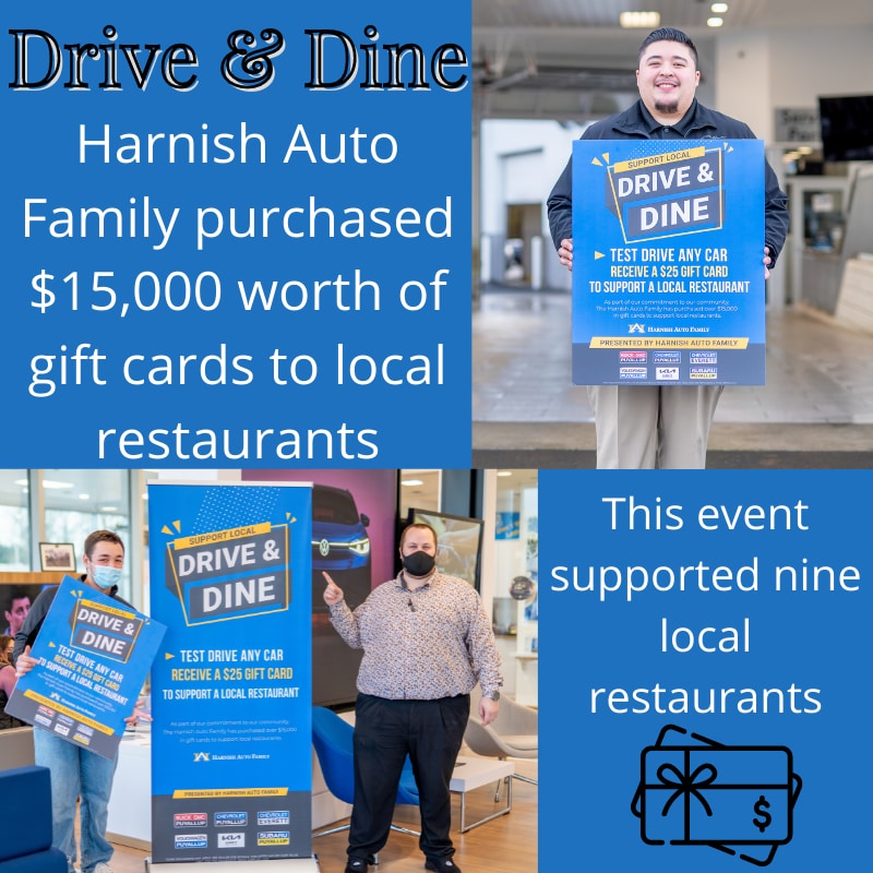The DRIVE & DINE EVENT idea was born in response to the devastating impact that COVID-19 had on our neighboring local businesses back in December of 2020. 50 gift cards [per store] were purchased from random at-risk restaurants and given to clients who took a test drive. The gift cards ran out fast. So fast, that on 1/6/2022, the 2nd Annual Drive & Dine Event was launched with the same intent. 600 $25 gift cards were purchased from 9 local restaurants in the Puyallup WA and Everett WA areas. The gift cards were distributed to customers who took test drives. No purchase necessary.