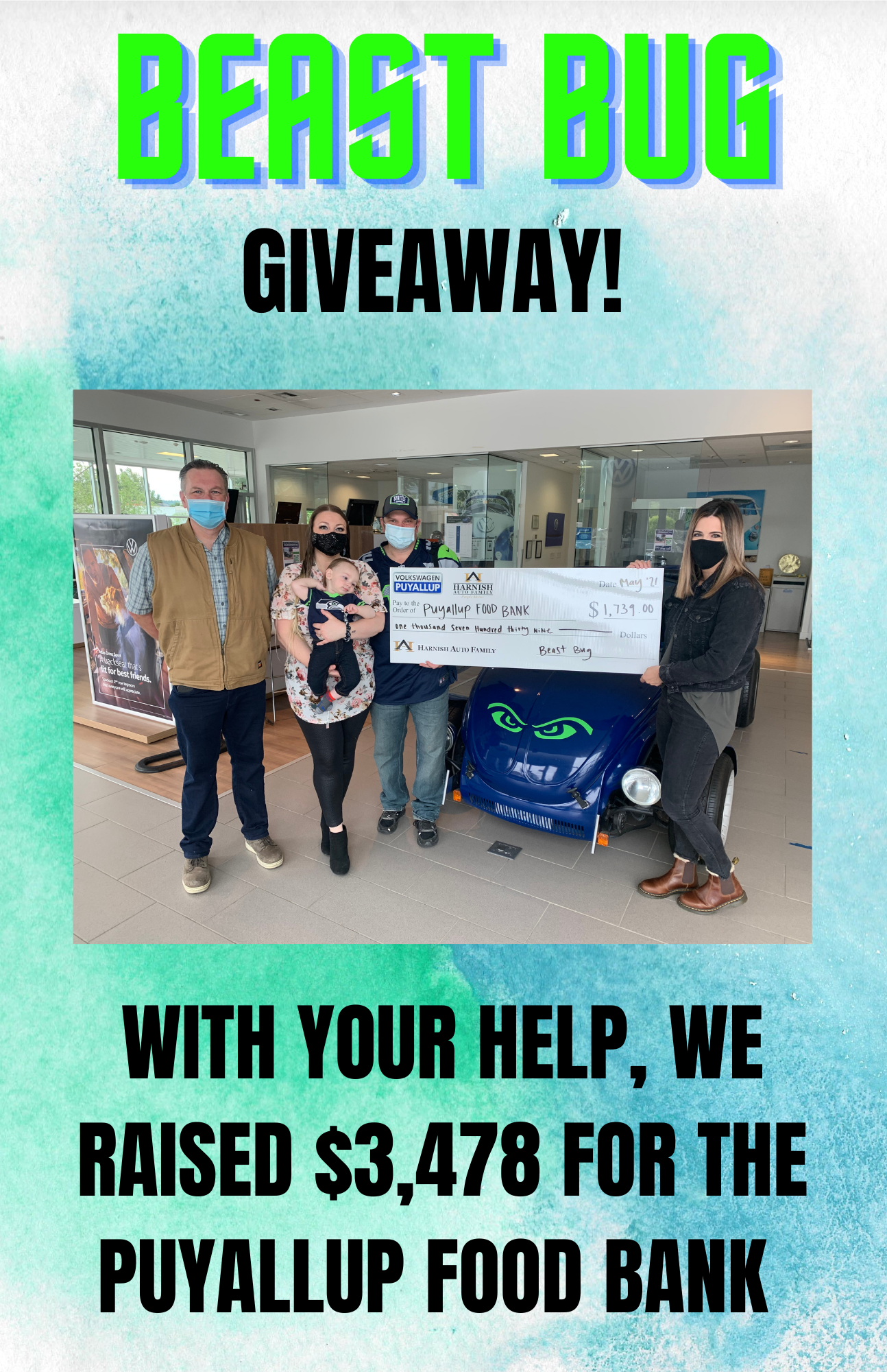 The Beast Bug has been a part of VW of Puyallup's store culture for about 5 years, and we wanted to pass it along to one of YOU and support the Puyallup Food Bank at the same time.Β
