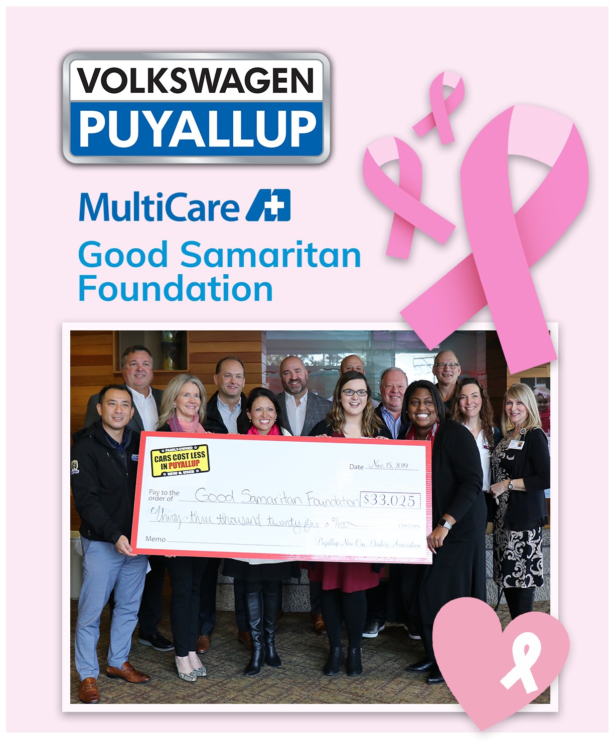 Every year as part of the Harnish Auto Family VW of Puyallup participates in October's Breast Cancer Awareness month. As part of 2019's initiative, we donated $25 for every car sold and presented a group check from the Puyallup Car Dealer's Association for $33,025!Β