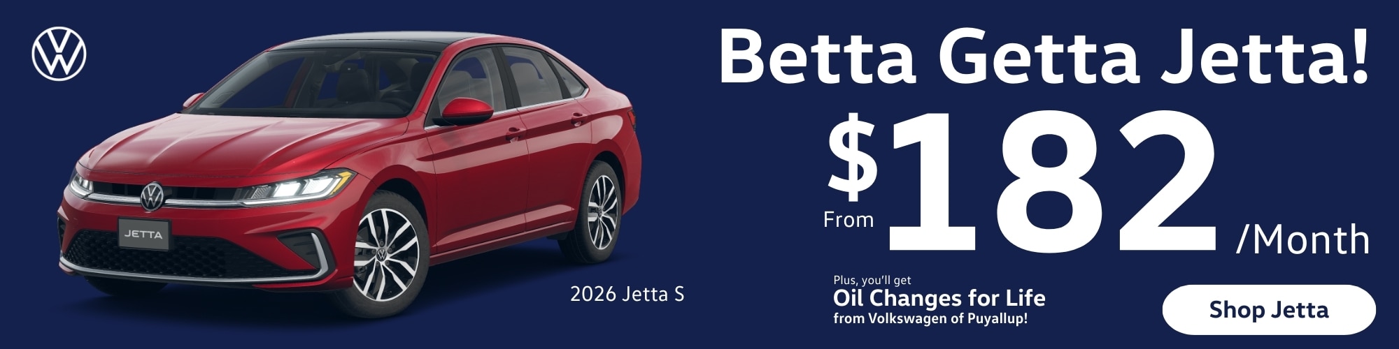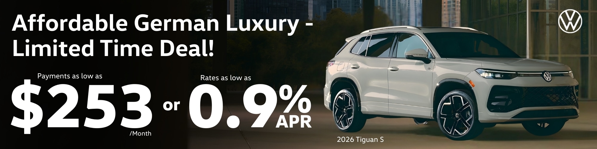 *Based on MSRP of $34,076.00 (including destination charges) for a 2026 Volkswagen Tiguan S Vin #3VVBR7RM7TM035649 excluding title, tax, options, and negotiable documentary service fee up to $200. 36 monthly payments of $253.49 total $9,125.64 plus licensing. $3,999 due at lease signing plus tax, title and licensing. Acquisition fee of $699 included in Lease Agreement. Purchase option at lease end for $22,149.40 after capitalized cost of $31,990.00. Includes $1,000 rebates. Limited to 10,000 miles per year. At lease end lessees responsible for $0.20/mile over 30,000 miles and excessive wear and tear. Dealer sets actual prices. Lessee responsible for insurance. Closed-end lease offered to highly qualified lessees on approved credit by Volkswagen Credit, Inc. Supplies limited. U.S. cars only. Additional charges may apply at lease end. Offer Expires: 4.30.26.*Based on MSRP of $25,270.00 (including destination charges) for a 2026 Volkswagen Jetta S Vin #3VW5W7BU8TM034957 excluding title, tax, options, and negotiable documentary service fee up to $200. 36 monthly payments of $182.92 total $6,585.12 plus licensing. $3,499.00 due at lease signing. Acquisition fee of $699 included in Lease Agreement. Purchase option at lease end for $16,172.80 after capitalized cost of $23,002.00. Includes $1,500 rebates. Limited to 10,000 miles per year. At lease end lessees responsible for $0.20/mile over 30,000 miles and excessive wear and tear. Dealer sets actual prices. Lessee responsible for insurance. Closed-end lease offered to highly qualified lessees on approved credit by Volkswagen Credit, Inc. Supplies limited. U.S. cars only. Additional charges may apply at lease end. Offer Expires: 4.30.26.