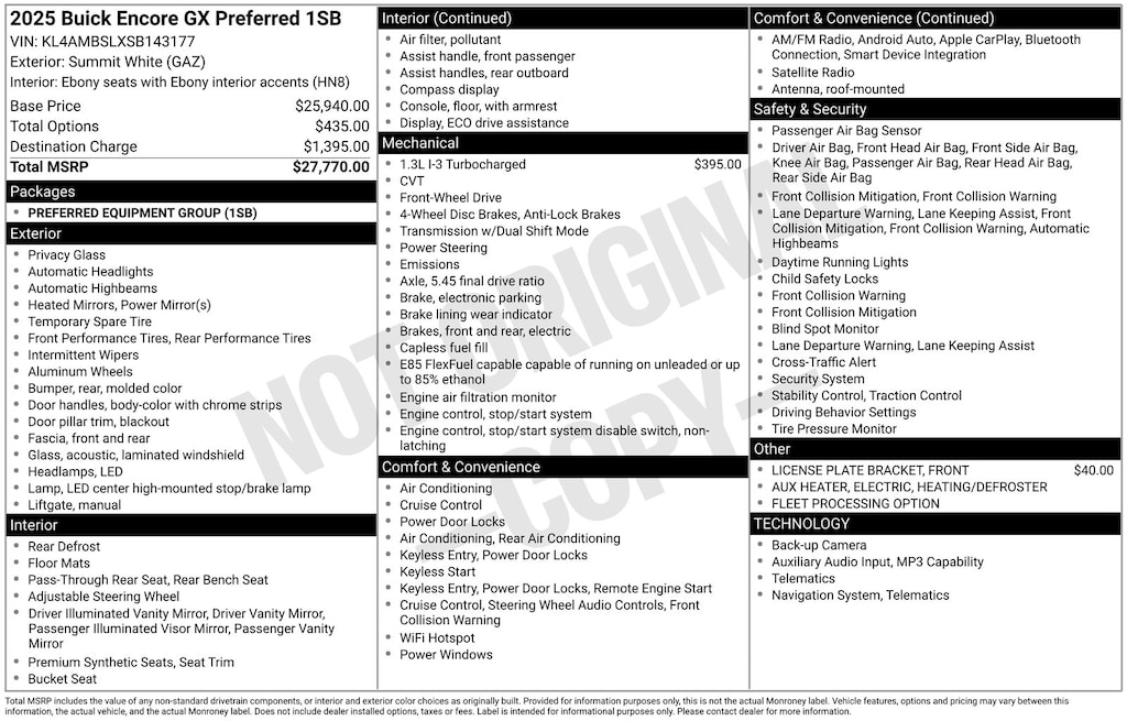 Step inside the Encore GX Preferred, and you'll be greeted by a wealth of premium features that elevate your driving experience. Enjoy the convenience of wireless Apple CarPlay and Android Auto, the clarity of the 6-speaker audio system, and the comfort of the cloth and leatherette-trimmed seating. The available driver-assistance technologies, including Automatic High Beams and Rear Window Wiper, further enhance your confidence on the road.