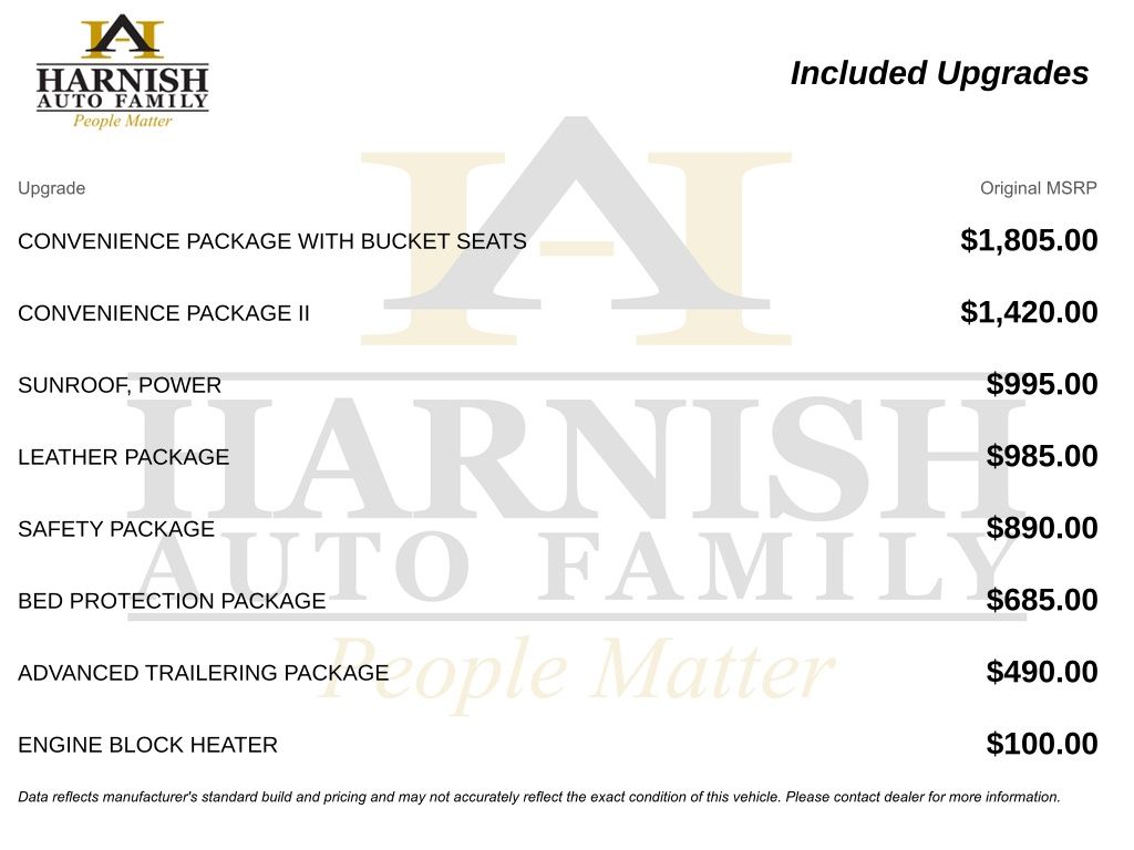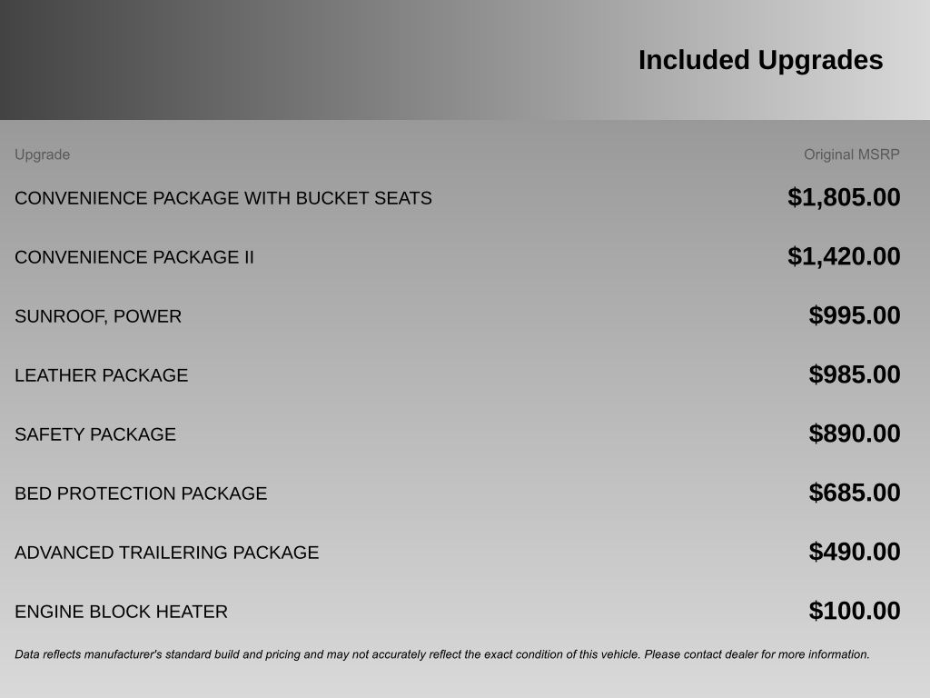 The Convenience and Leather packages change the day-to-day experience. Front bucket seats with center console, dual-zone automatic climate control, heated front seats, heated steering wheel, power driver seat with lumbar, and Bose premium audio make it comfortable for commuting or long highway drives. The power sunroof adds light without giving up the solid Crew Cab space you need for passengers or gear.