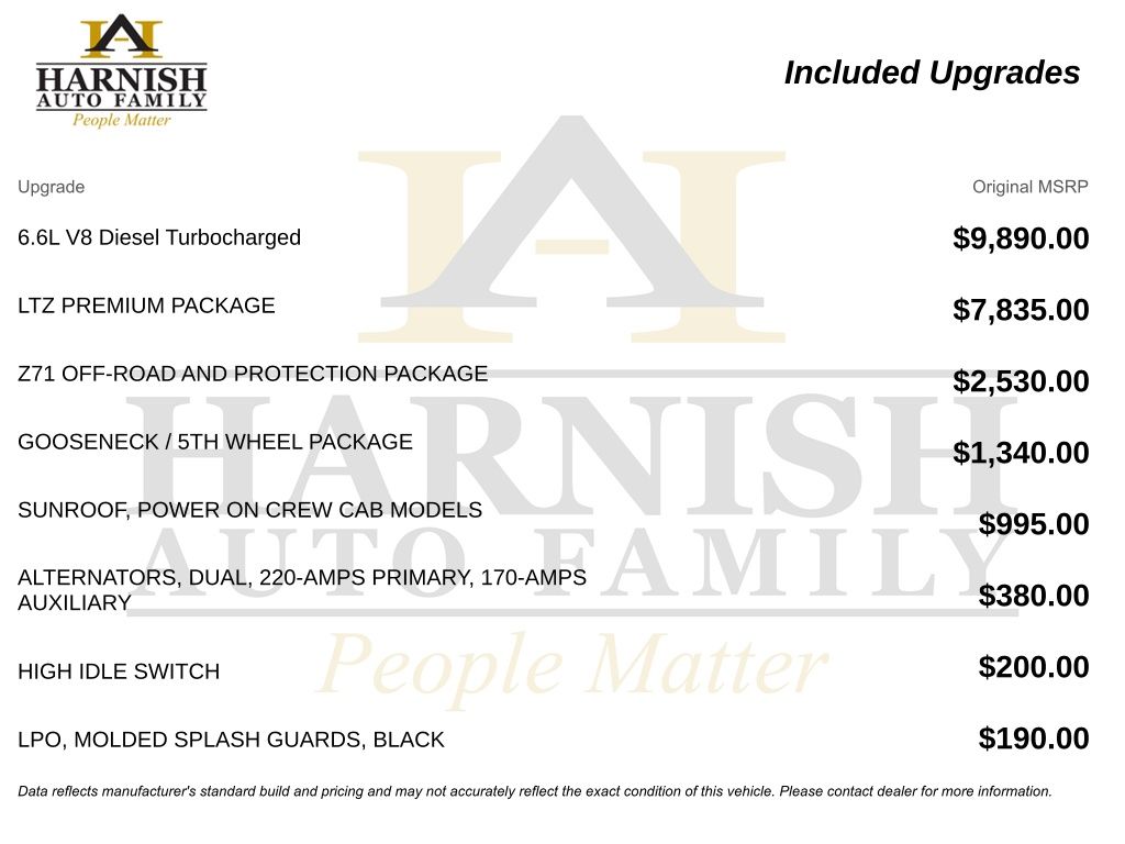 Optional equipment on this LTZ includes the Duramax 6.6L Turbo-Diesel, LTZ Premium Package with bucket seats and center console, power sunroof, Z71 Off-Road and Protection Package, Gooseneck/5th Wheel Prep Package, Snow Plow Prep/Camper Package, high idle switch, upfitter switch kit, LED roof marker lamps, trailer tire pressure monitoring system, and polished 20-inch wheels.
