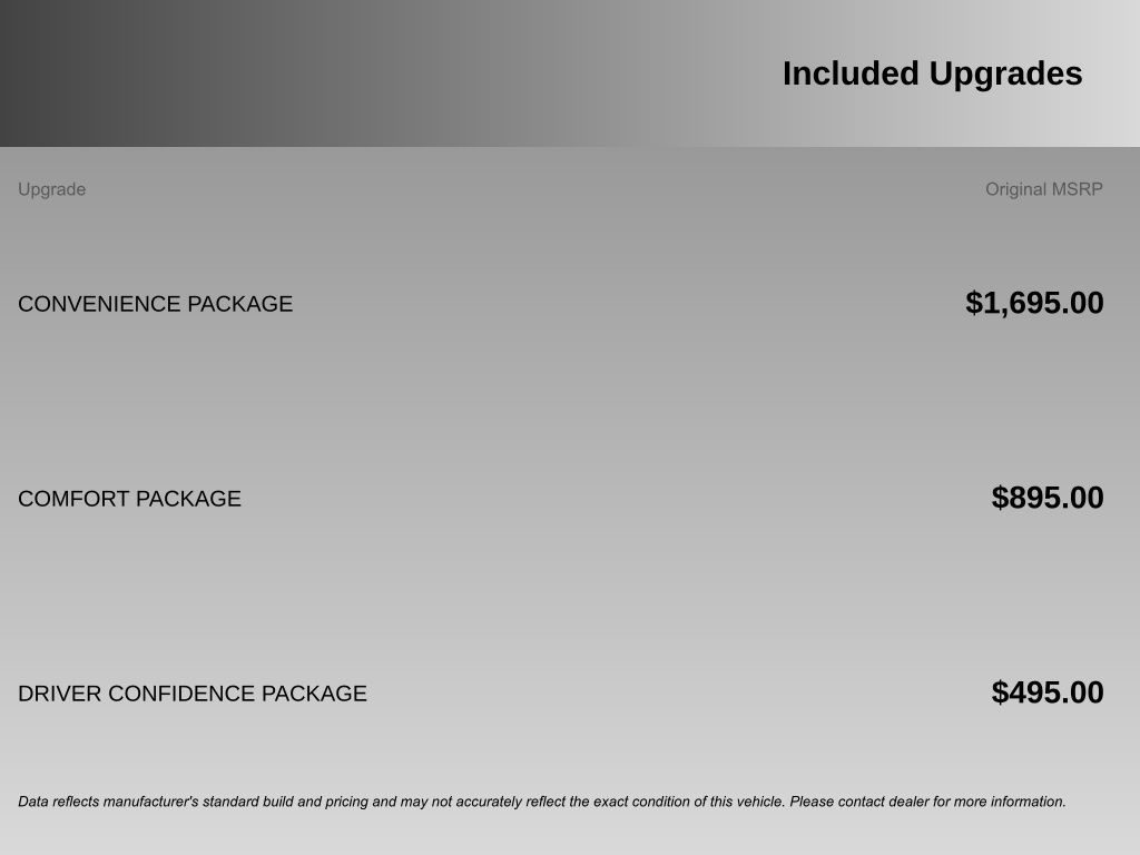 Comfort Package with heated steering wheel, 8-way power driver seat with 2-way power lumbar, heated front seats, and leather-wrapped steering wheel