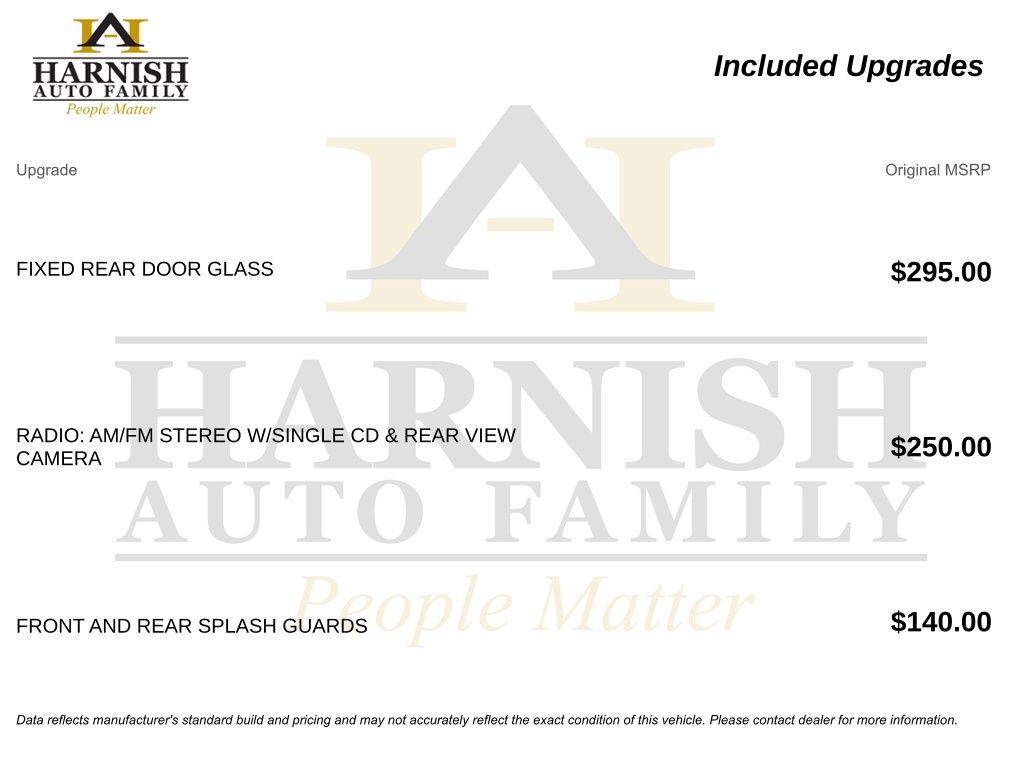 While every reasonable effort is made to ensure the accuracy of this data, we are not responsible for any errors or omissions contained on these pages. Please verify any information in question with a dealership sales representative. Tax, title, license and dealer fees (unless itemized above) are extra. Not available with special finance or lease offers. See dealer for details, restrictions and availability. A documentary service fee in an amount up to $200 may be added to the sale price or capitalized cost. The Documentary Service Fee is a negotiable fee.
