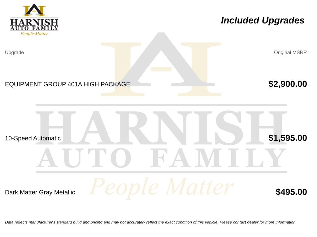 While every reasonable effort is made to ensure the accuracy of this data, we are not responsible for any errors or omissions contained on these pages. Please verify any information in question with a dealership sales representative. Tax, title, license and dealer fees (unless itemized above) are extra. Not available with special finance or lease offers. See dealer for details, restrictions and availability. A documentary service fee in an amount up to $200 may be added to the sale price or capitalized cost. The Documentary Service Fee is a negotiable fee.