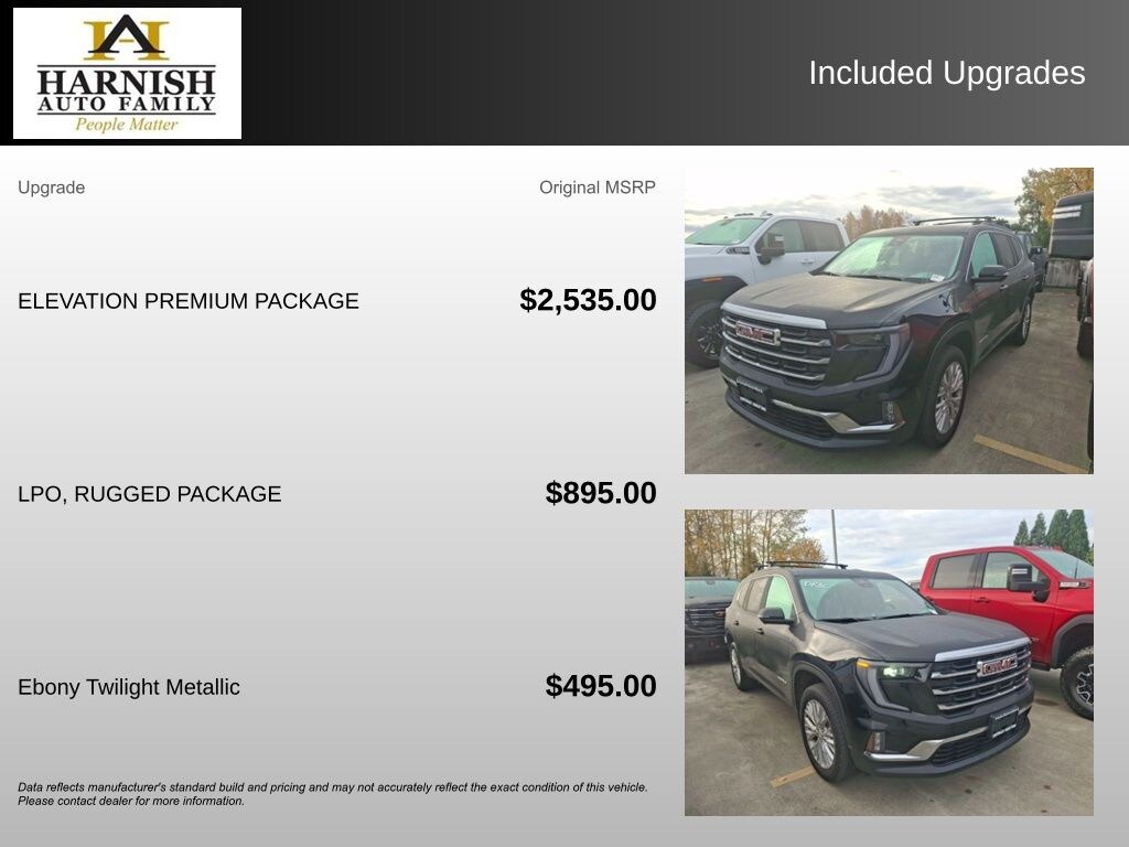 Experience the Difference at Chevrolet of Puyallup. As one of the top dealers in the NW, we make it easy. With Care-Free Maintenance , No Worry Warranties, Accessory Discounts and the best Customer Rewards Program in the NW. 2025 GMC Acadia Elevation {Exterior Color}
