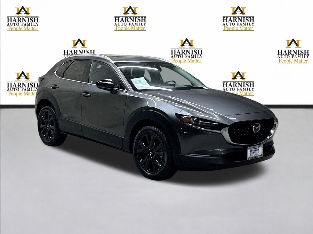 Optional equipment on this CX-30 includes the Turbo Premium Package with leather-trimmed interior, heated front seats, power moonroof, Mazda Navigation, Bose premium audio system, adaptive headlights, and 18-inch aluminum alloy wheels.